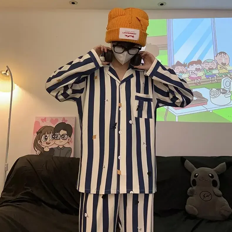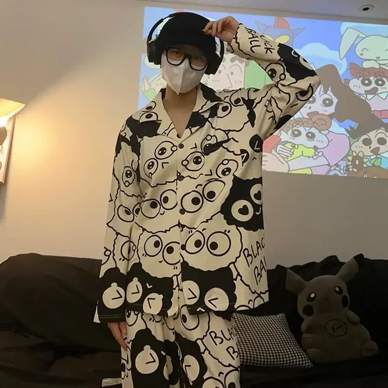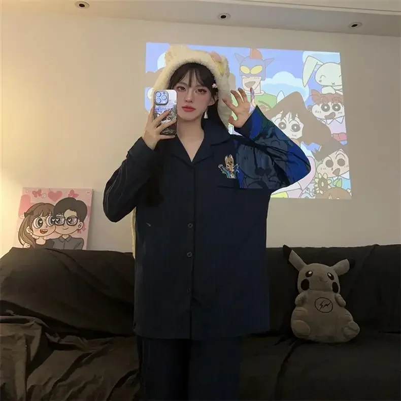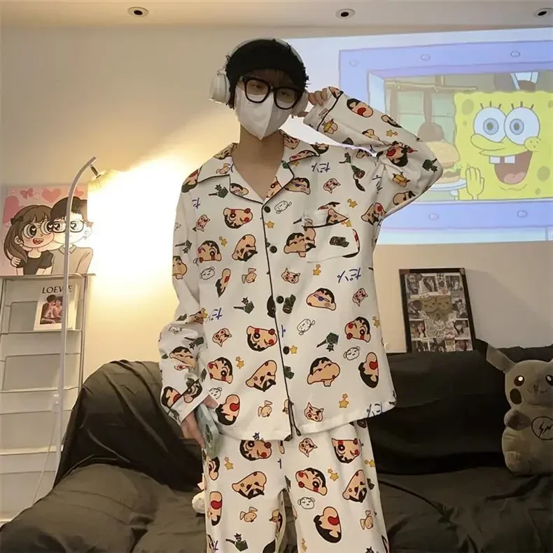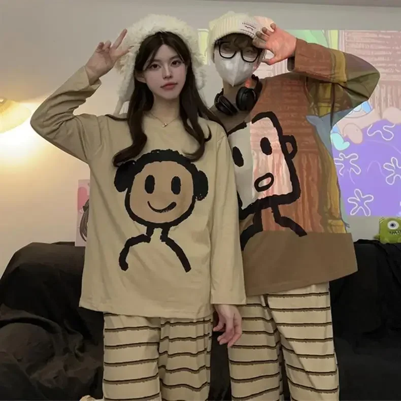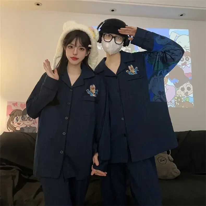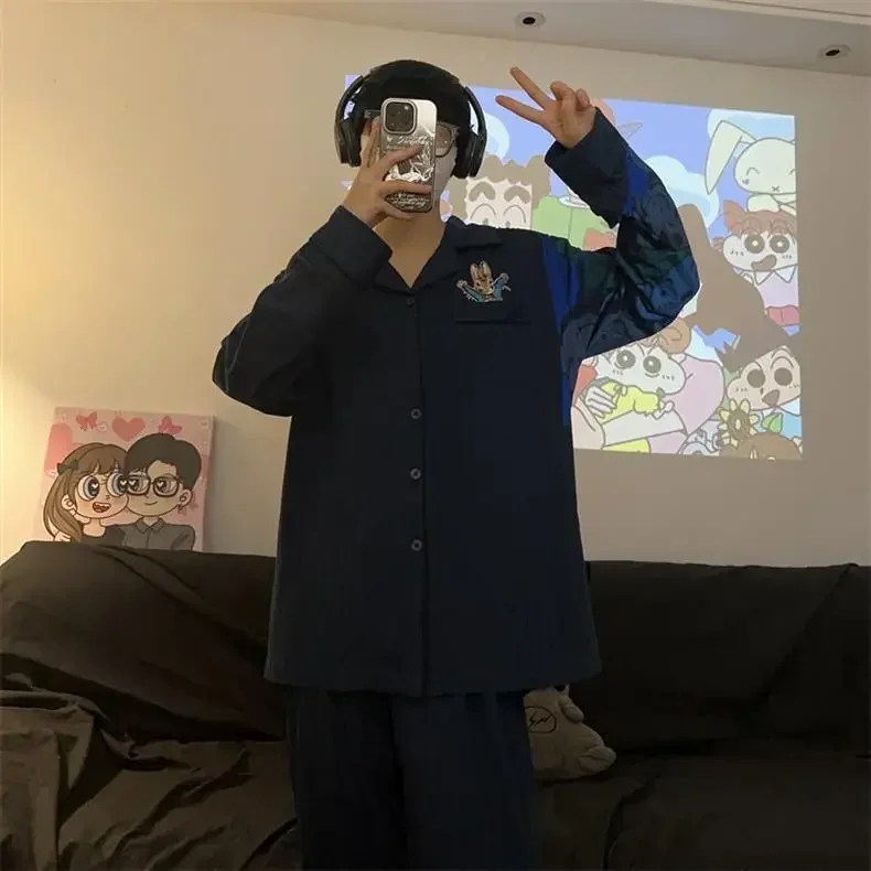 Stay cozy and stylish at home with this cartoon-themed pajama set for couples. Made from soft cotton and polyester, featuring a turn-down collar, long sleeves, and matching trousers, it’s perfect for spring and autumn lounging.