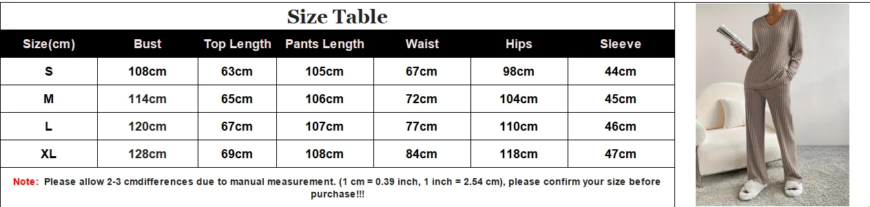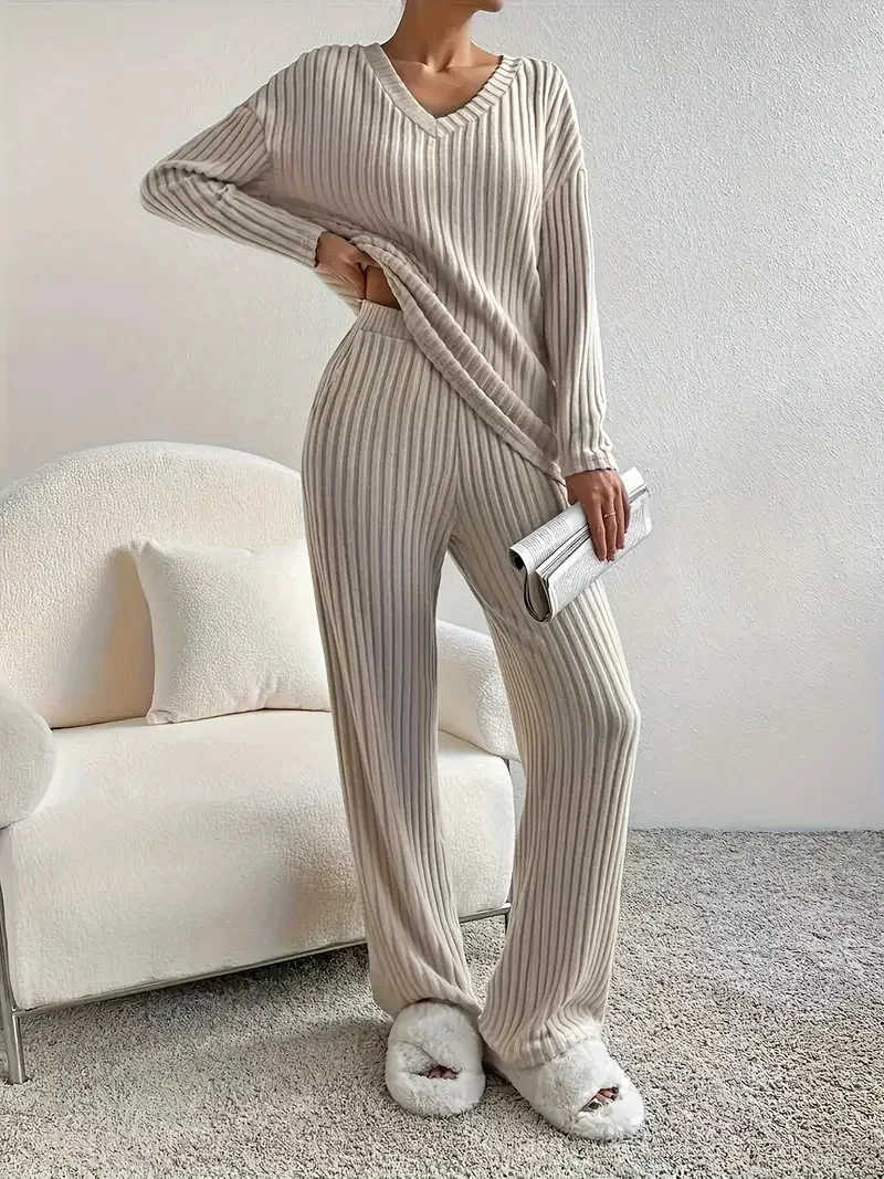 Stay stylish at home with our spring fashion women's homewear set featuring straight-leg pants and a loose-fit V-neck ribbed knit sweater.